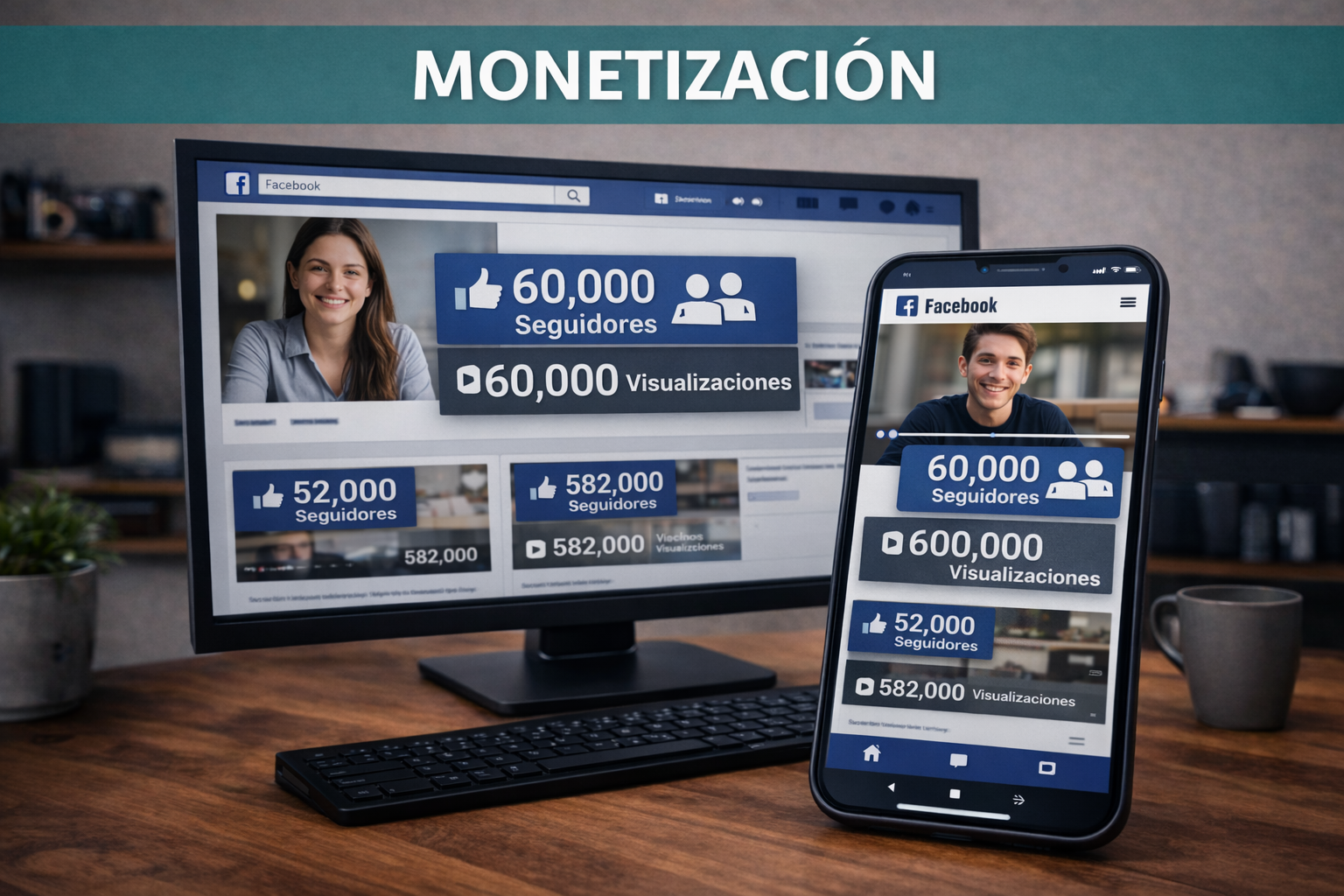 Para Facebook se ofrecen servicios de crecimiento y visualizaciones, como metas de 60K o 600K, según los requisitos que solicite la plataforma para activar la monetización.